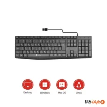 این صفحه کلید دارای سیمی به طول 1.5 متر است و درگاه اتصال آن با سیستم USB می باشد. کیفیت این سیم مثل دیگر محصولات از نوع معمولی است. تعداد کلید های این صفحه 113 هست و حروف فارسی بر آن حک شده است و نیازی به تهیه برچسب نخواهید داشت.